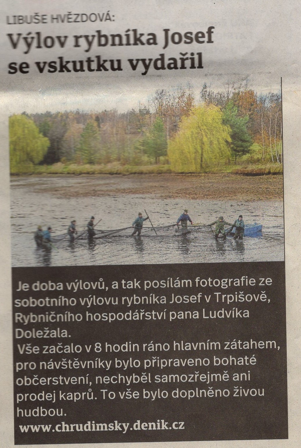 Výlov rybníka Josef v Trpišově je velkou událostí. Přečtěte si článek Libuše Hvězdové z Deníku Chrudimska o jeho úspěšném průběhu.